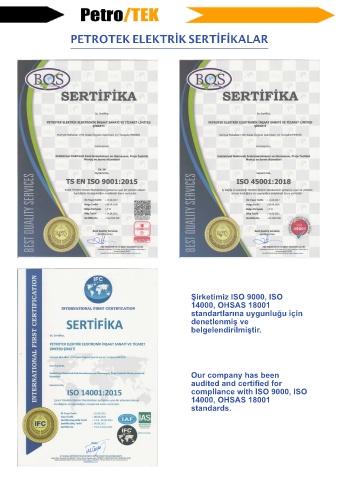 PETROTEK ELEKTRİK SERTİFİKALAR Şirketimiz ISO 9000, ISO 14000, OHSAS 18001 standartlarına uygunluğu için denetlenmiş ve belgelendirilmiştir. Our company has been audited and certified for compliance with ISO 9000, ISO 14000, OHSAS 18001 standards.